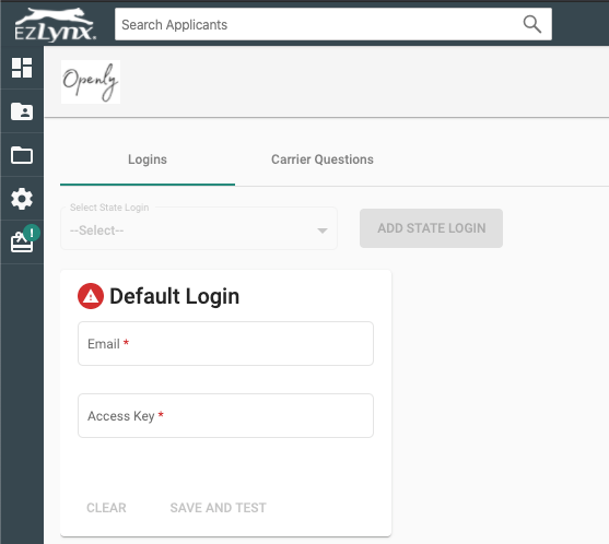 10. Clicking on Openly will bring you to the page above. Enter the email you use to log in to the Openly Agent portal, and paste or enter the Access Key code from step 6. Click Save and Test.