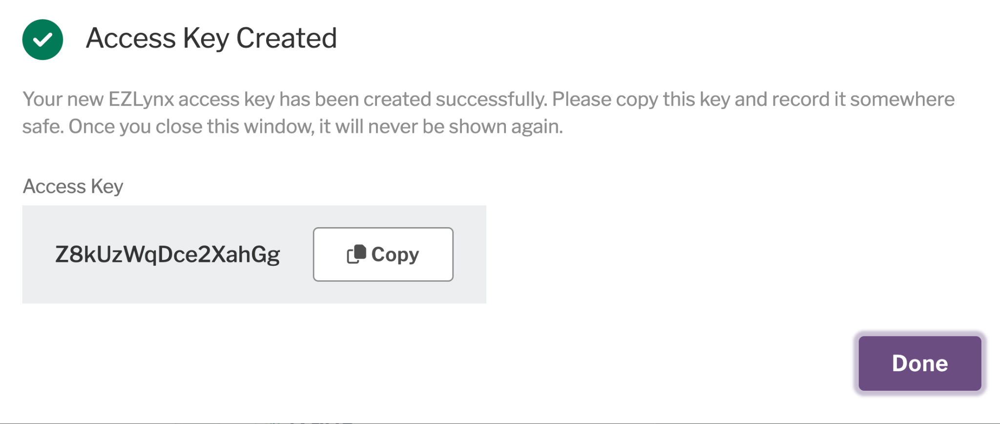 5. DO NOT close this box until the Access Key is copied. If you accidentally close it, you can click the Delete Key button to generate a new key. Each agent should have their own key to associate with their Openly credentials.